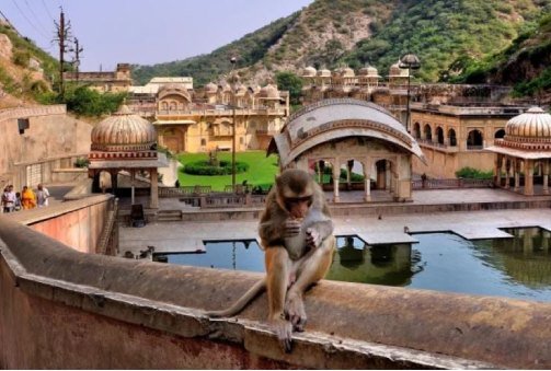 Templo de Galtaji: - O templo também é conhecido como o templo dos macacos, devido à grande quantidade de macacos que ali vivem. Dedicado ao deus Hanuman, foi fundado no século XVI por Diwan Rao Kriparam, conselheiro do rei Sawai Jai Singh II.